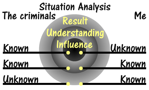 Below I have made a schematic picture of how I look at this. In the middle is the influence. Around the influence is the understanding about it, which has changed the result, which is outermost. The criminals know what the influence is, I don’t know that. Both the criminals and I understand the influences, but not in the same way. I know what the result has been, the criminals don’t know that. It is clarifying for me to look at this picture. It shows known and unknown factors for the criminals, and known and unknown factors for me. Two known, and one unknown factors, is a strong position. The result is the most important factor to know what is; and it is I who know the result. My position is comparatively good, it could have been much worse.