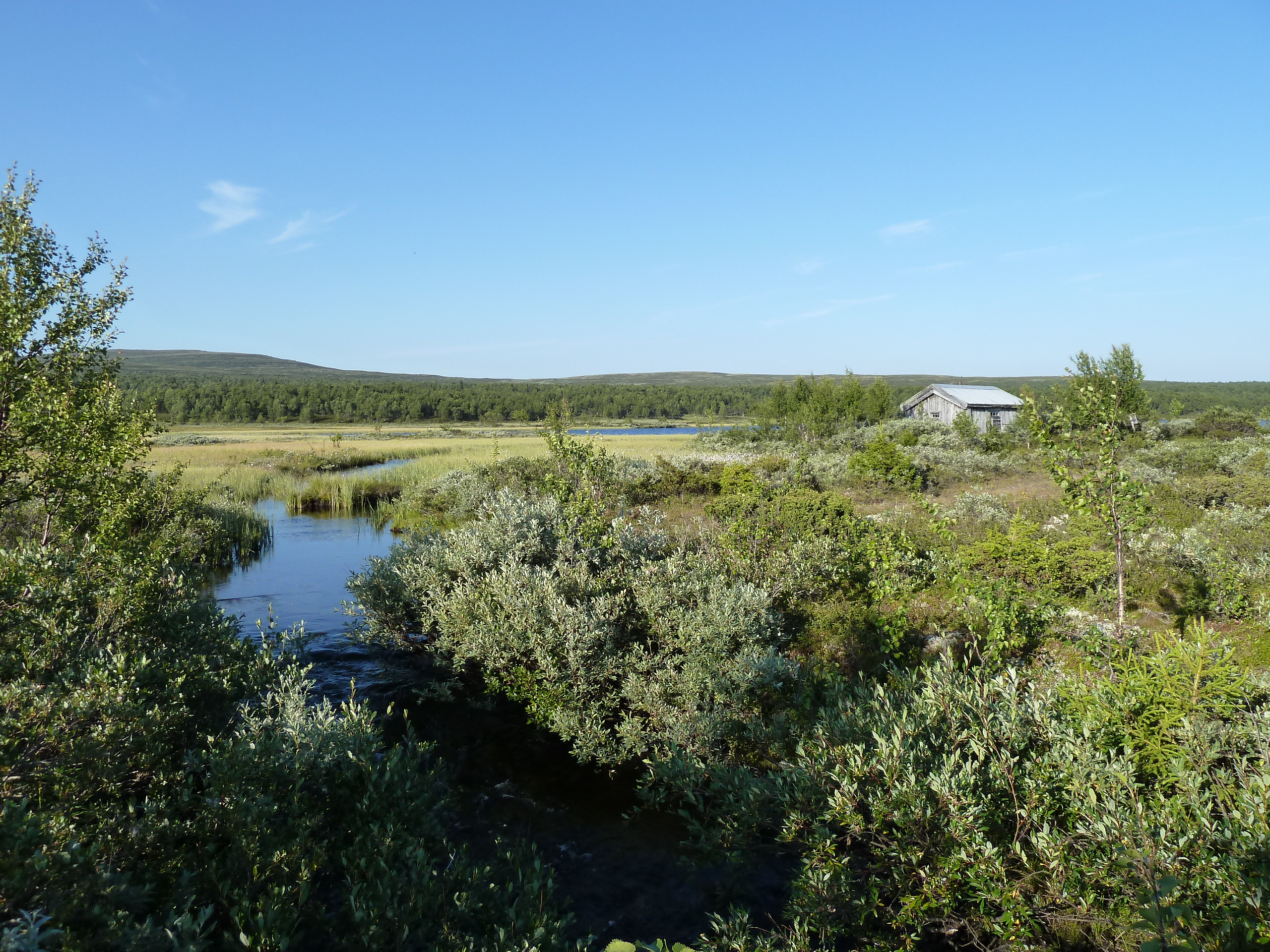 West of Røytjønn / Røytjern (Char Lake). A creek called Røya (The Char) flows out at the west end of the lake. This is a wetland area. Around the lake, there are both dry grounds, and wet grounds. It is necessary to have rubber boots with one here; but, if you also have light shoes, it is possible to use them on dry grounds. There are many bogs here; some parts of them can be dangerous. If you walk to this lake without rubber boots, you will be very wet on your feet before you are here. Saturday, August 22, 2015.