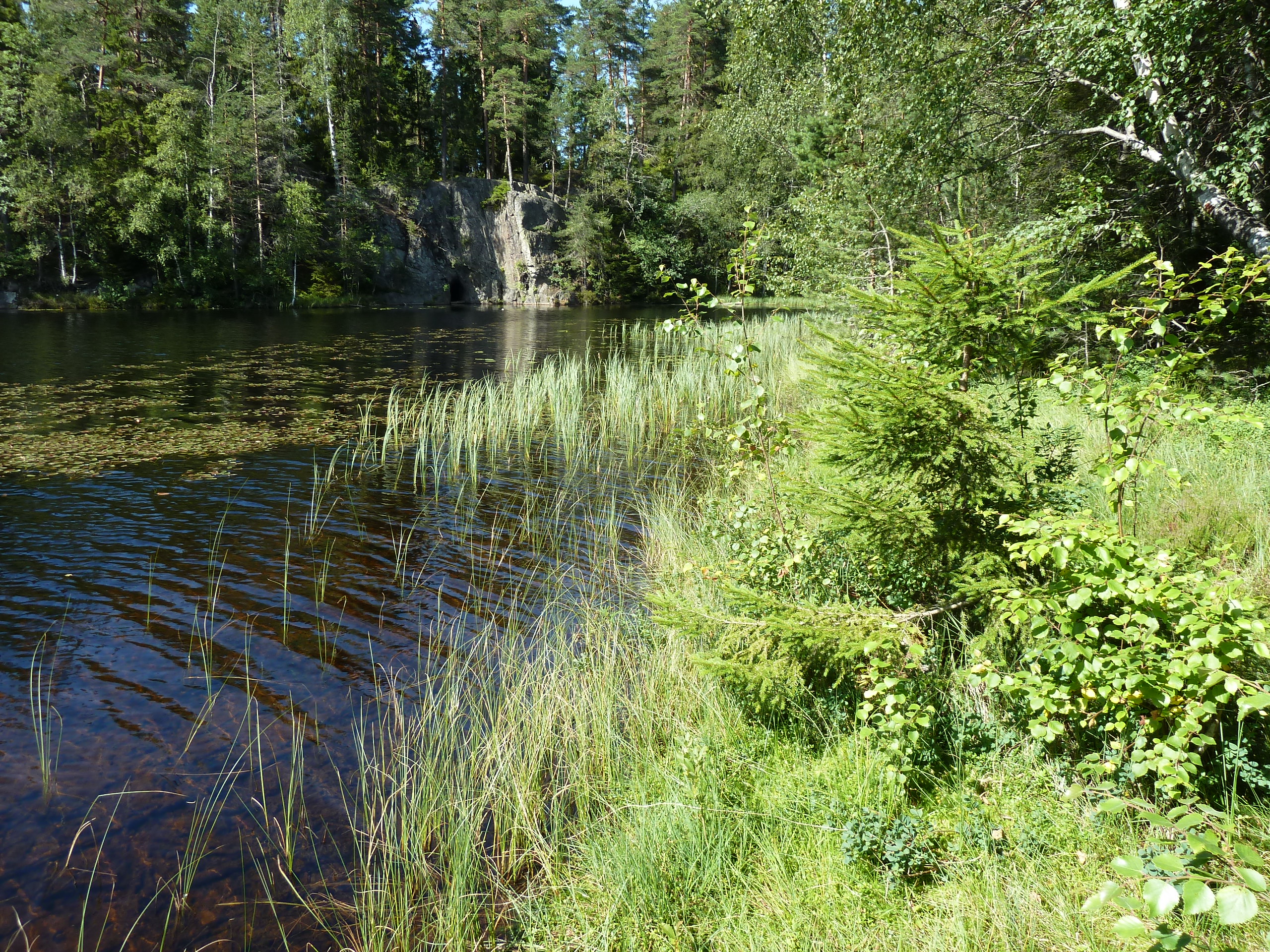 North‐west Kroktjern (Hook Lake). The black cave by the water's edge in the middle of the image, is a man‐made tunnel. It is 164 yards long. It is called Kroktjerntunnelen (The Hook Lake Tunnel). A brook runs out from the other end. This tunnel was made in 1947 to increase the water feed to Lutvann (Lut Lake). Lutvann was drinking water for Oslo from 1918 to 1977, among other drinking water resources. It is no knowledge about the name Lutvann. Lutvann has from a long time ago been understood as very clean water. Today Lutvann is reserve drinking water supply. Thursday, August 13, 2015. www.davidhegg.info |